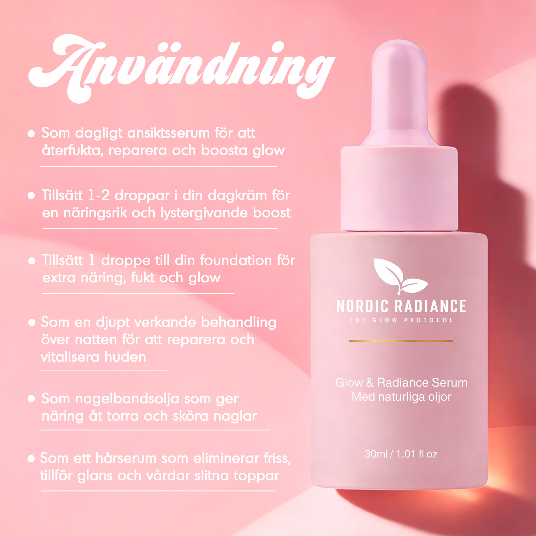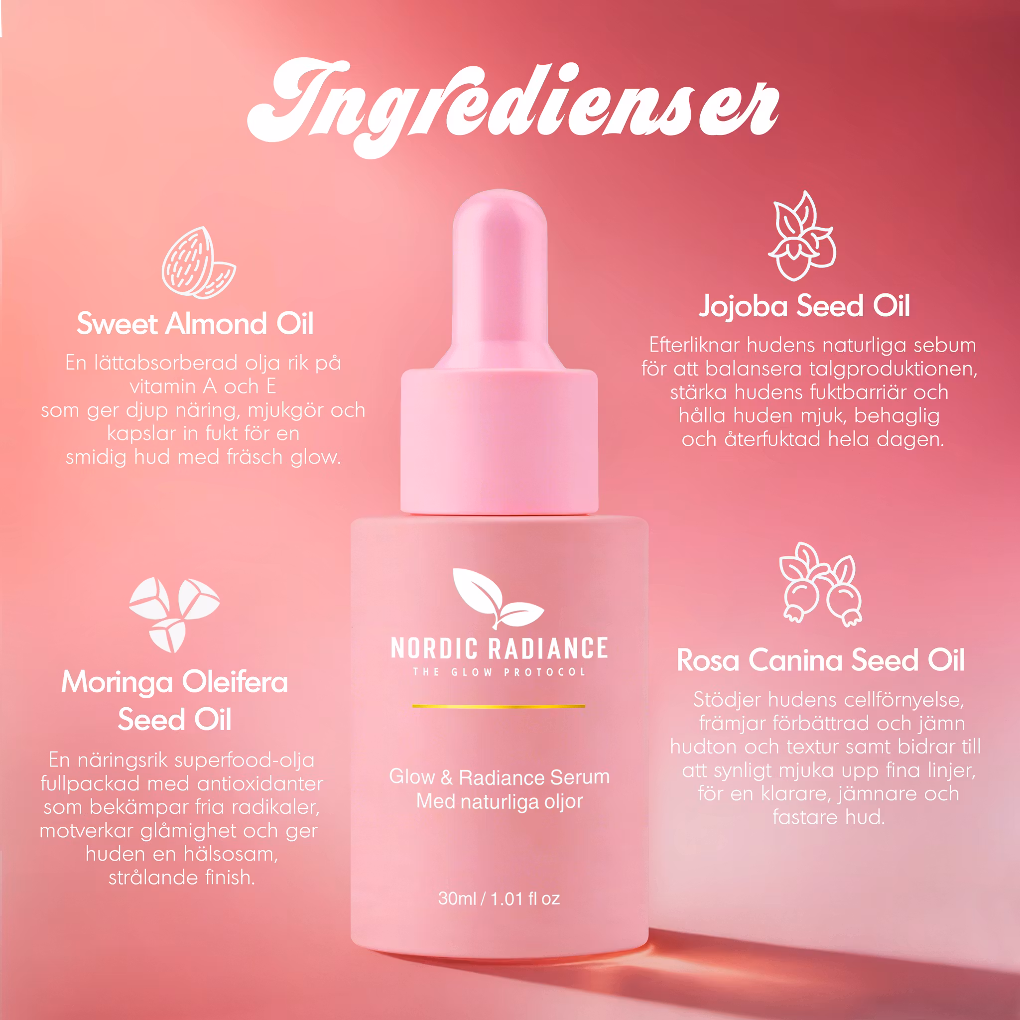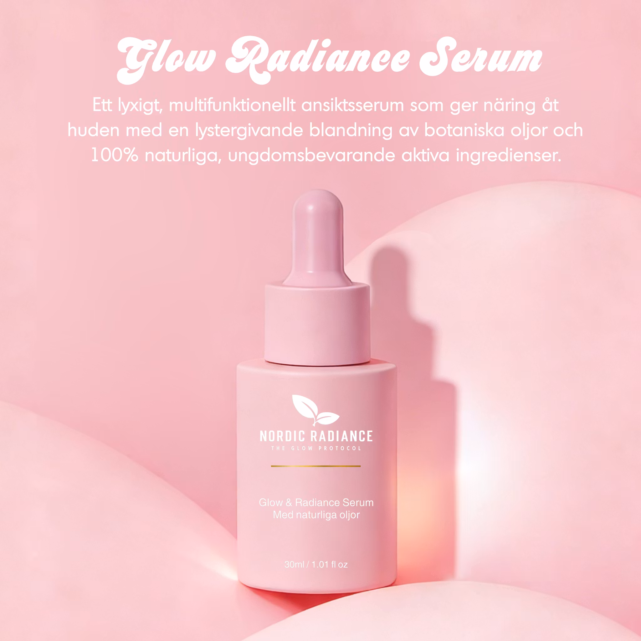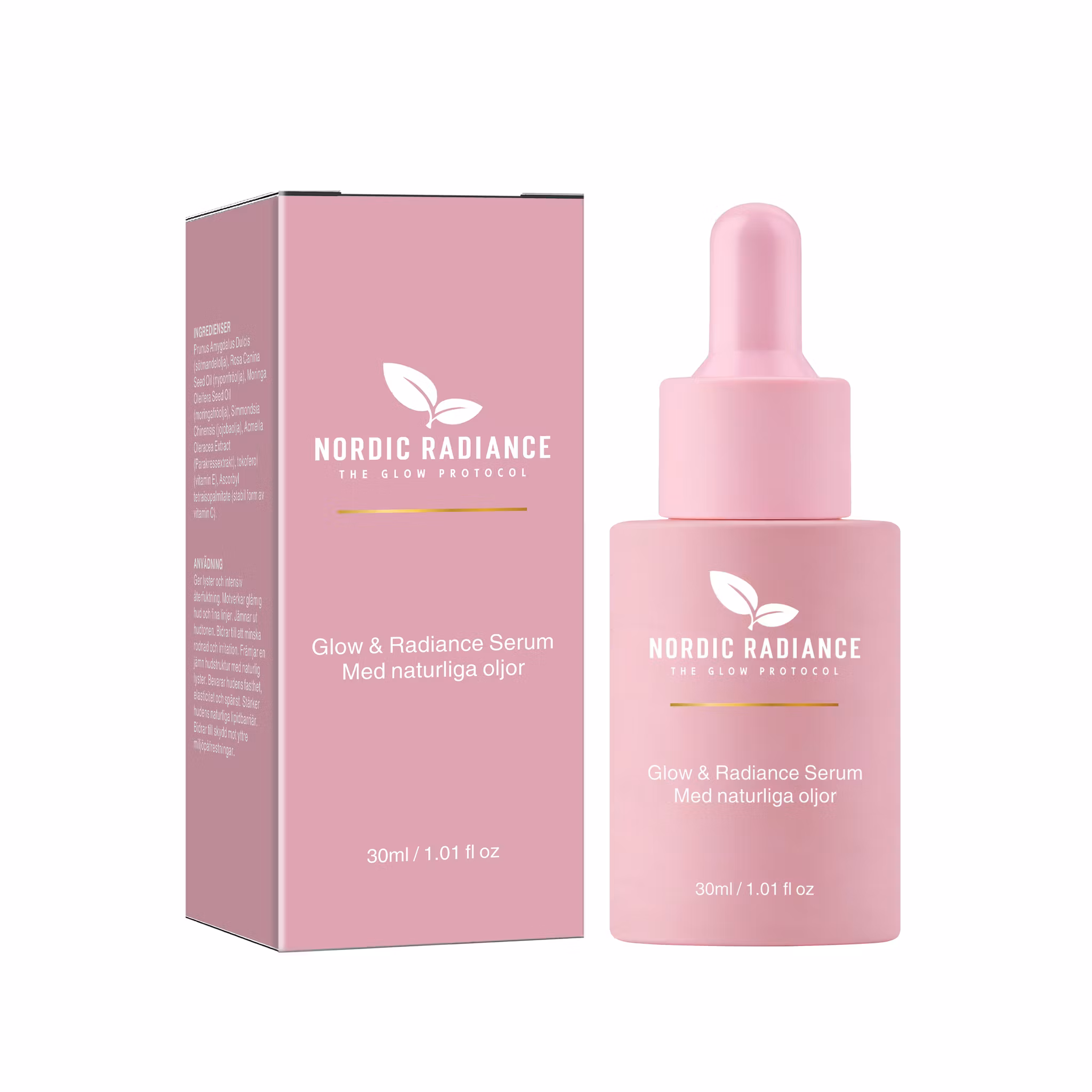 Glow & Radiance Serum är ett exklusivt ansiktsserum med 100% naturliga oljor, utvecklat för att ge huden intensiv näring, fukt och naturlig lyster. Den silkeslena oljebaserade formulan absorberas snabbt och lämnar huden återfuktad, balanserad och med glow. Serumet är framtaget med noggrant utvalda, kallpressade växtoljor och botaniska extrakt som vårdar huden på djupet och förbättrar hudens utseende , utan parfym eller syntetiska tillsatser och endast 100% naturligt innehåll. Passar alla hudtyper, även känslig hud. Alla ingredienser är baserade på växtextrakt och innehåller inga artificiella konserveringsmedel, doftämnen eller färgämnen. Glow & Radiance är serumet för dig som vill få jämnare hudton, återfuktad hud, motverka ålderstecken, ge huden glow & lyster och främja förbättrad hudstruktur 🌸
